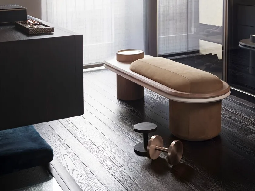 Wooden Bench LIZ-BENCH by Giorgetti is a sophisticated piece of furniture that embodies modern design and elegance. The bench features a stunning Canaletto walnut wood top-plate, available in three exquisite finishes