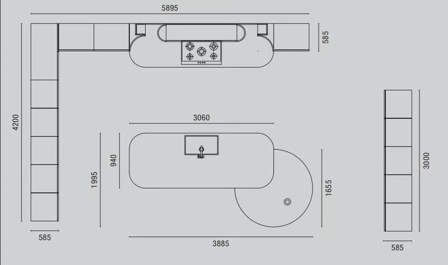 The INCANTO 3.0 kitchen is a comprehensive composition designed to meet all your culinary needs. It includes full-height tall units, base units with semi-circular ends, and open side compartments that enhance both storage and display options. This thoughtful arrangement allows for seamless integration into your home, providing both beauty and functionality in one cohesive design.