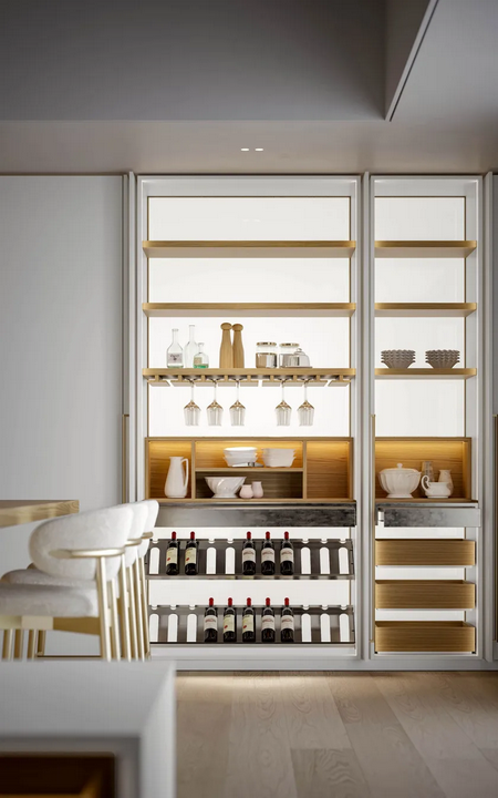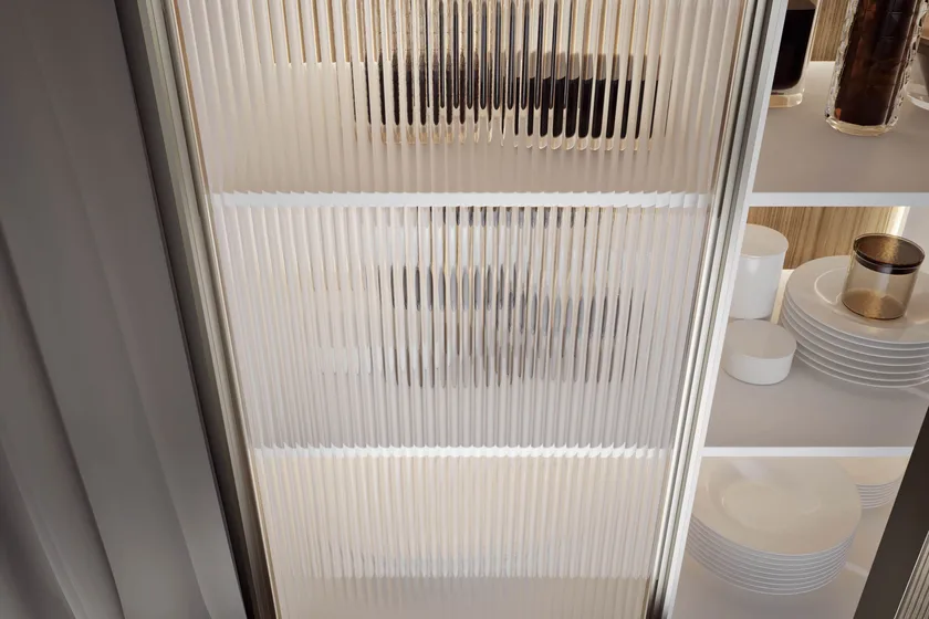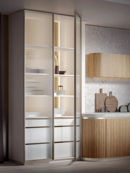 The INCANTO 3.0 features exquisite design details that enhance its overall aesthetic. The ribbed clear glass doors of the tall units, framed with Champagne metal, add a touch of glamour and sophistication. The semi-circular ends of the base units provide a smooth transition in design, while the open compartments invite creativity in organization and decor. Each element is meticulously crafted to offer a cohesive and visually stunning kitchen experience.